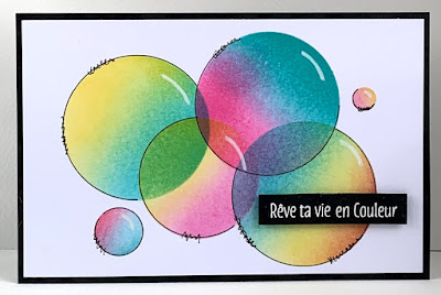 Pour cette carte j’ai choisi de réaliser des bulles en m’aidant du Lot de 6 masques et pochoirs de Toutencolle et du pochoir Toutencercles.