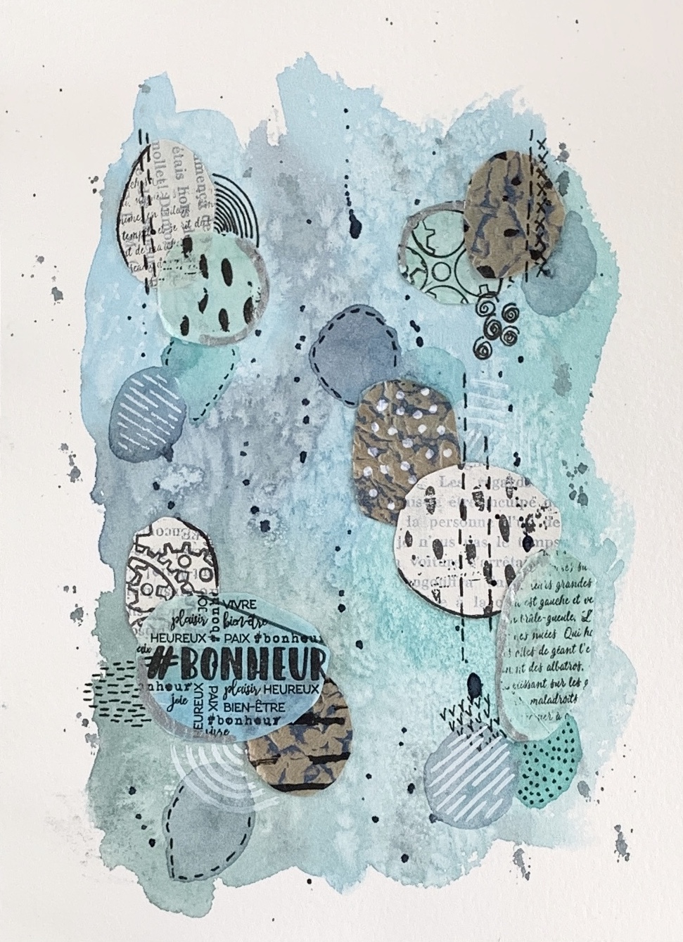 J’y ajoute aujourd’hui des collages réalisés avec des papiers de récupération sur lesquels j’ai mis des couleurs et des marques avec différents feutres.