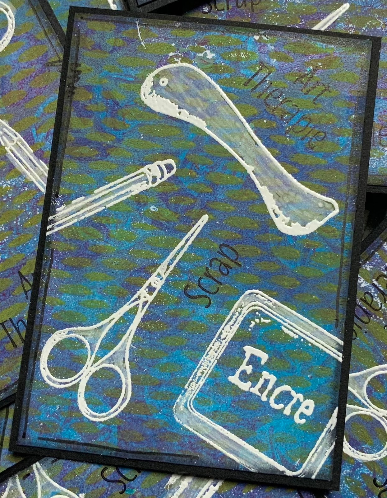 La dernière étape est le collage sur les bases ATC en Maya noir dont les mesures sont 2,5 x 3,5 inches (soit 6,35 x 8,9 cm).