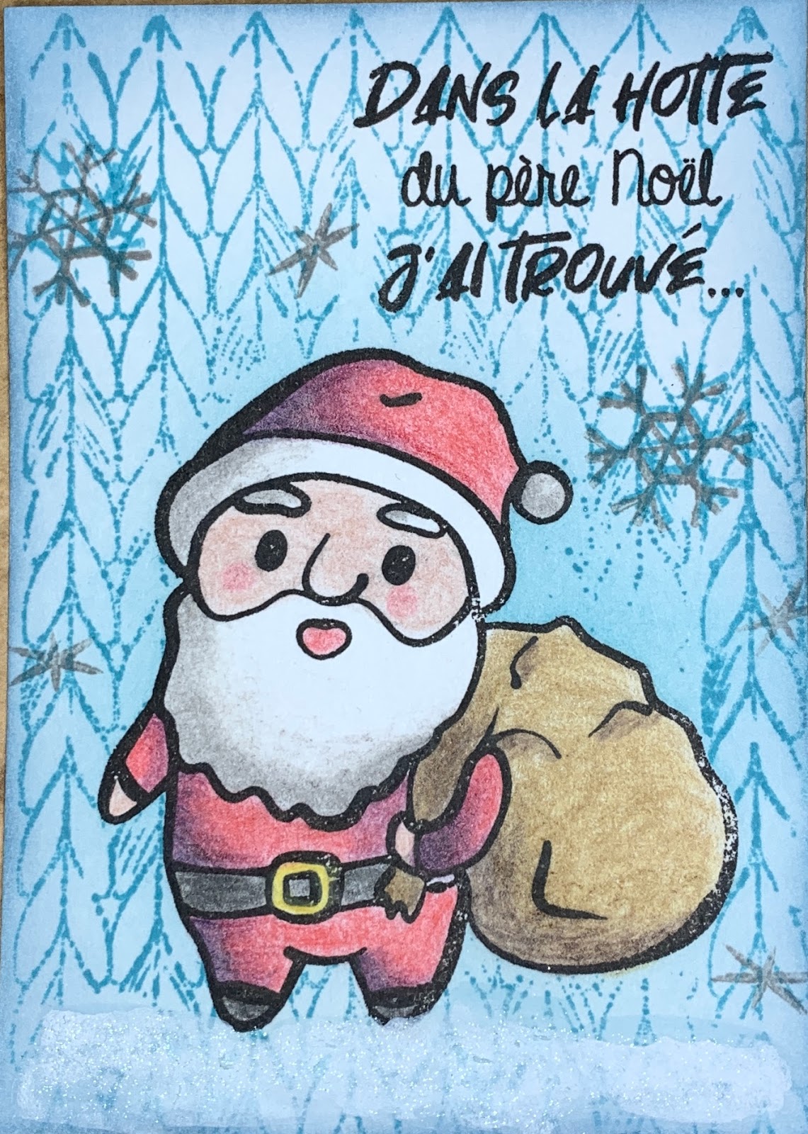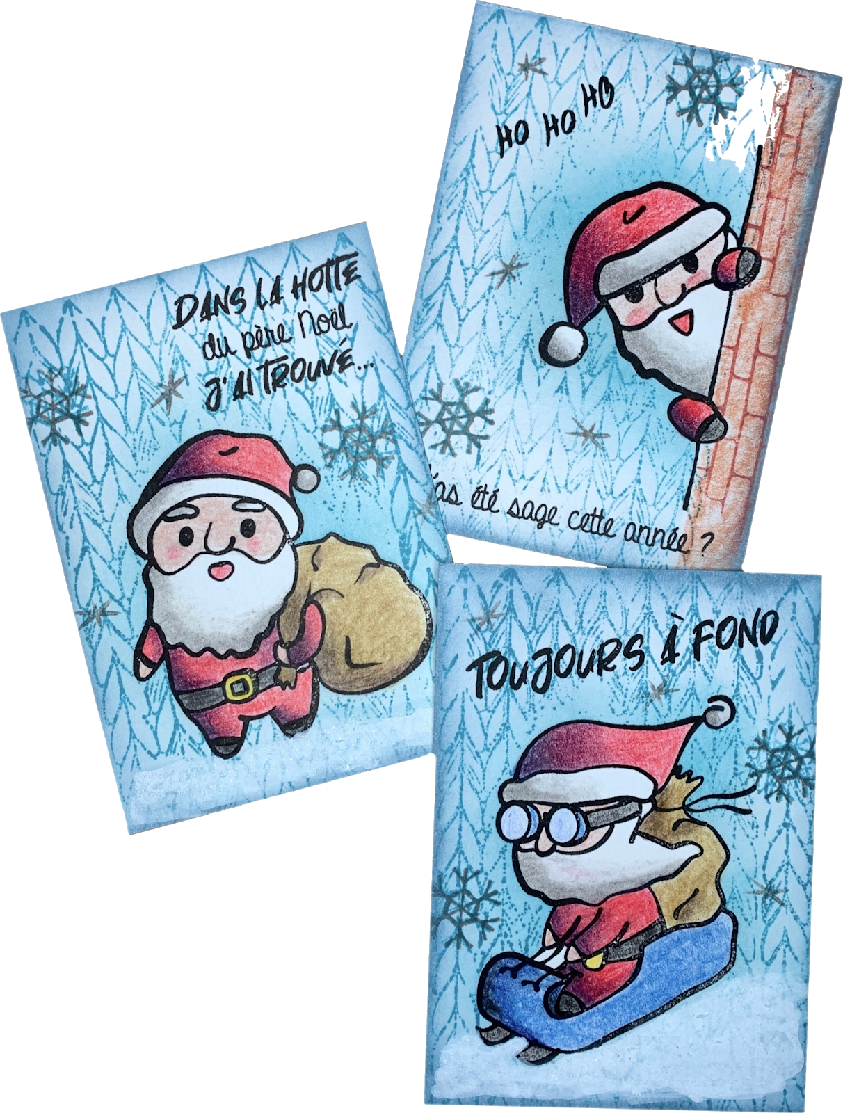 je vous propose 3 ATC réalisées avec les planches de tampons « Noël en coulisse » et « Cristaux d’hiver » de Crazy Little Craft.