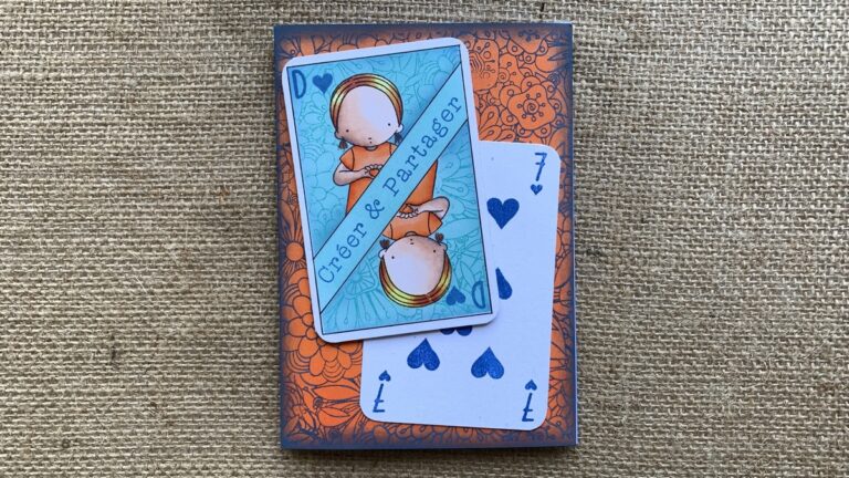 Sur le modèle de la dame et du 7 de Coeur, une carte avec du masquage et une mise en couleur aux feutres à alcool.