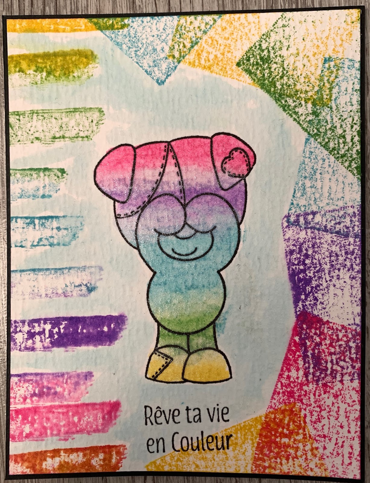 J’ai mis en couleur le tampon « Tom bouquet Surprise » avec des Distress et un pinceau paillettes ✨.