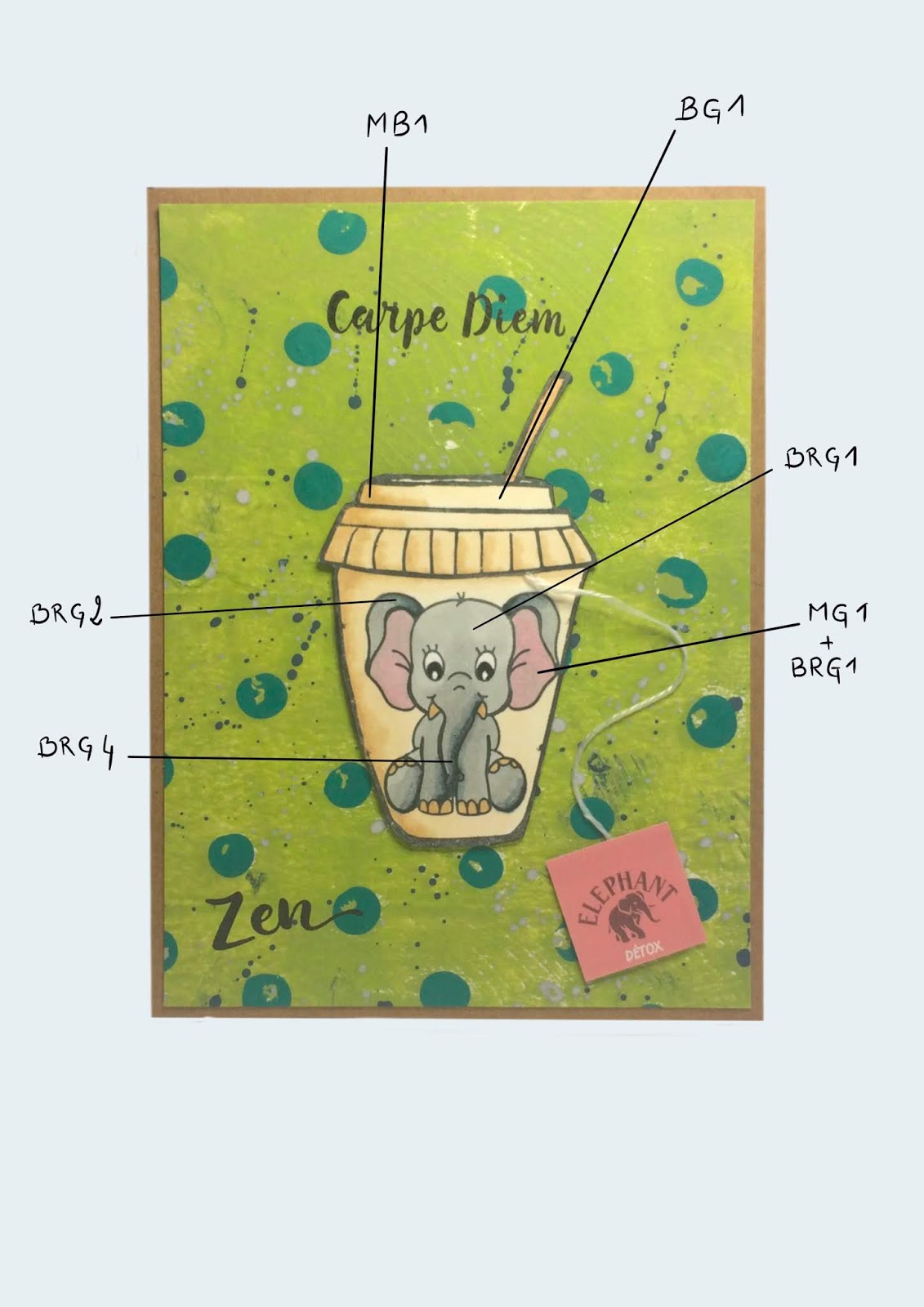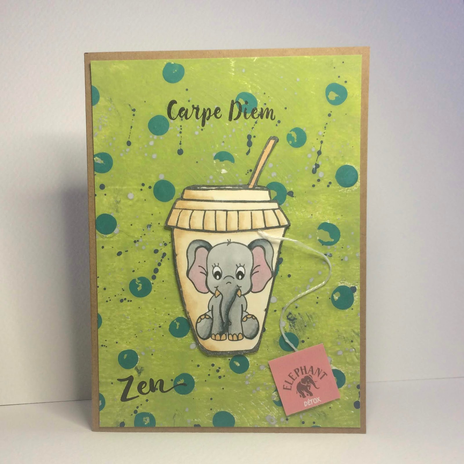 C’est donc tout naturellement que j’ai utilisé la planche de tampons « Gobelets » de Jennifer C. sur laquelle j’ai ajouté le petit éléphant de la planche « Éléphants ».