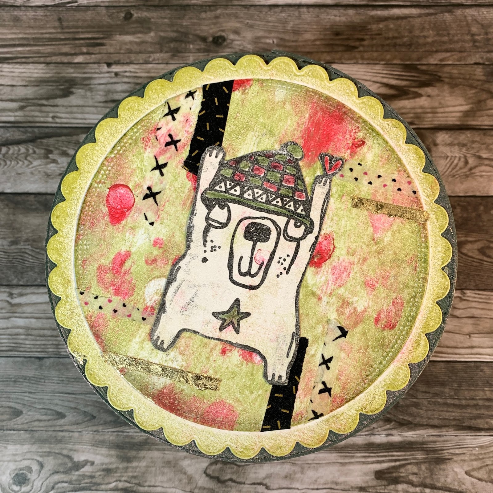 - de la peinture Fresco Finish Paper Artsy (dans les coloris winter green -pour peindre la boîte- Zucchini et Cherry Red – pour la Gel Press)