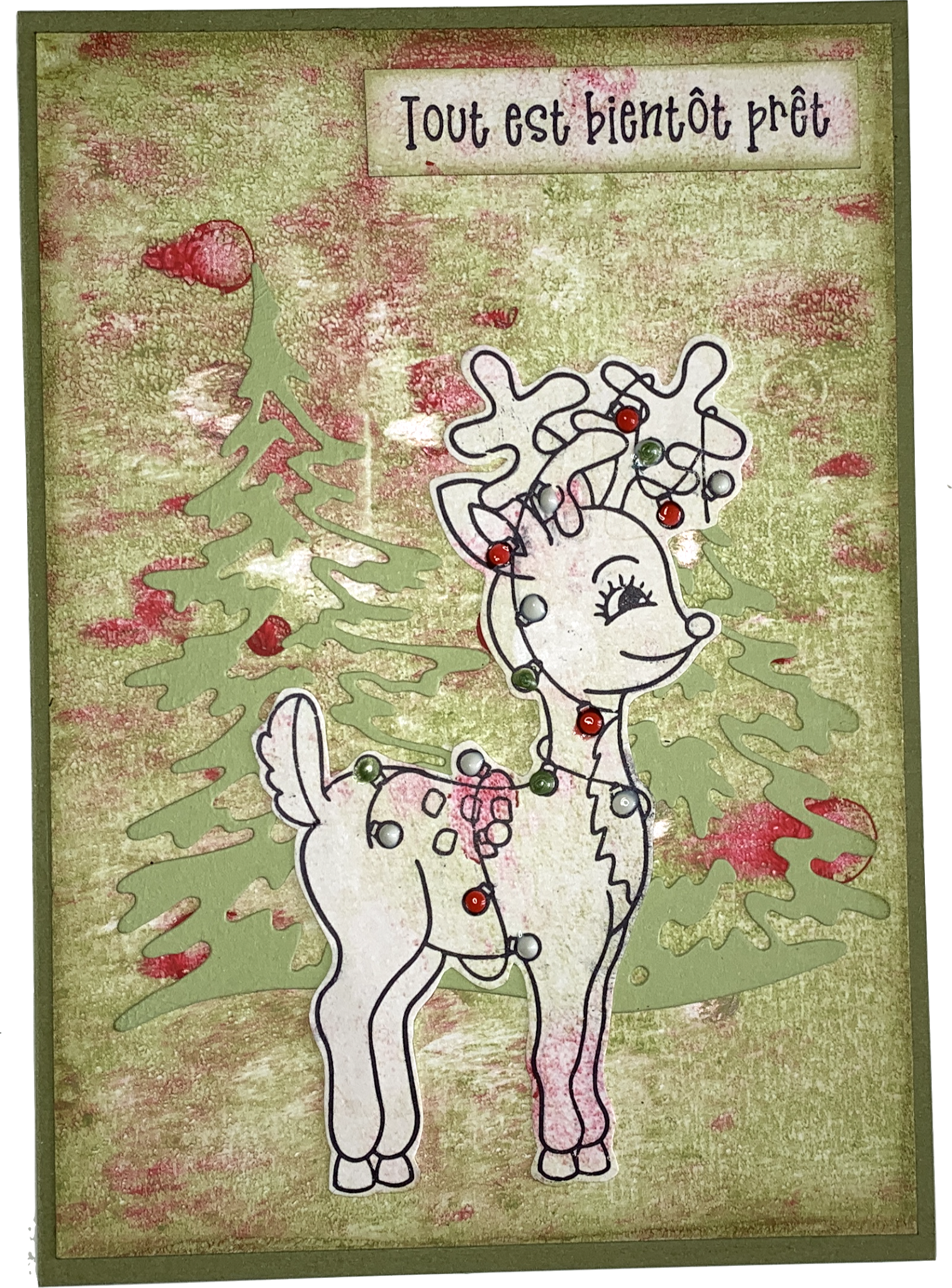 Le personnage central est issu de la planche « Eclair se prépare » est tamponné avec l’encre Archival Jet Black ; les petites lumières sont réalisées avec des Crytsal Drops (coloris Oyster Grey, Red Berry et Bottle Green).