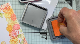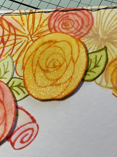 Voilà ce qu’on obtient. On va pouvoir passer au remplissage du contour avec les fleurs et feuilles de la planche Composition florale 2 en utilisant les coloris de Distress Oxide : Abandonned Coral, Spiced Marmelade, Scattered Straw, Shabby Shutters et Peeled Paint