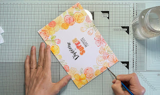 J’ai refait des tamponnages de plusieurs fleurs toujours en variant les couleurs et toujours dans le papier aquarelle mais cette fois l’idée est de les découper pour les coller en volume à quelques endroits sur le pourtour. Je n’oublie pas d’encrer le contour pour masquer les tranches blanches : pour ça, je passe ma découpe directement sur le pad d’encre correspondant.