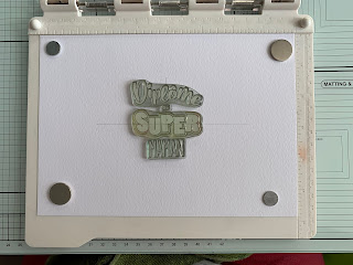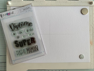 J’ai tracé un repère par un trait de crayon léger au centre de la feuille afin de positionner au mieux les tampons de la planche diplôme ; je referme le couvercle de la presse à tamponner et je retire le tampon «super» de l’ensemble afin d’encrer tous les autres à la Versafine Onyx Black . Je laisse bien sécher et gomme mon repère au crayon.