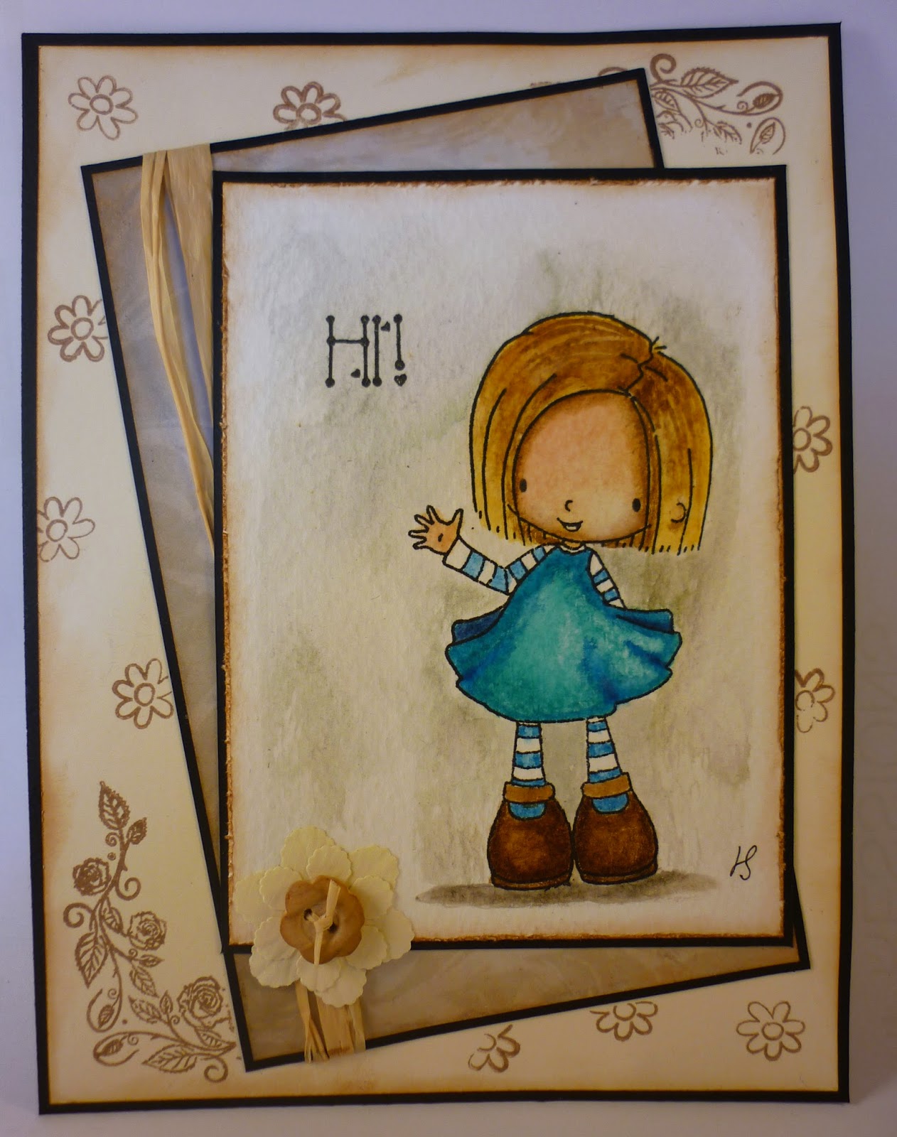 Coucou !! Voici une carte réalisée avec le tampon « Ellie says hi » de Tiddly Inks ; j’ai réalisé la mise en couleur avec des encres Distress traitées comme de l’aquarelle, j’aime vraiment beaucoup cette technique, j’espère que vous aimerez à votre tour !!