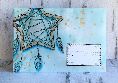 Le bleu du fond est réalisé avec une Distress Oxide coloris « Tumbled Glass » et une aquarelle dorée Gansai Tambi (qui m’a été offerte, je n’ai donc pas de lien…).