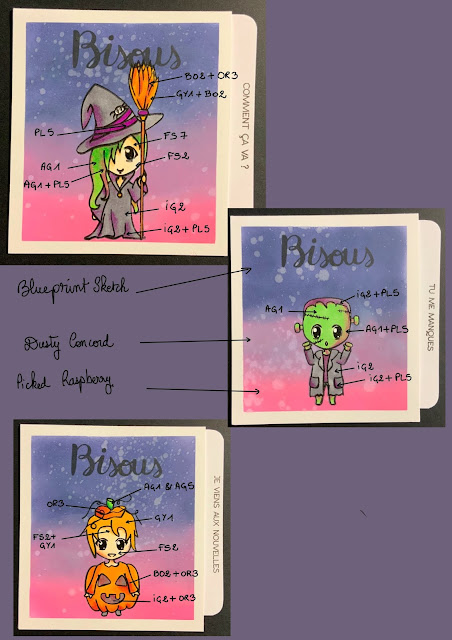 Les fonds sont faits d’un dégradé de Distress Oxide (les coloris utilisés sont indiqués dans l’illustration ci-dessous), les personnages sont tamponnés à la Memento Tuxedo Black pour permettre une mise en couleur aux feutres à alcool Spectrum Noir ; je vous ai indiqué toutes les références juste en dessous sur la photo.