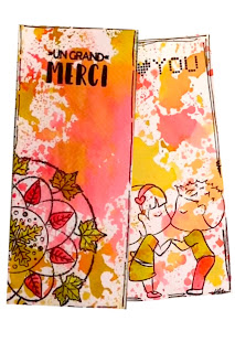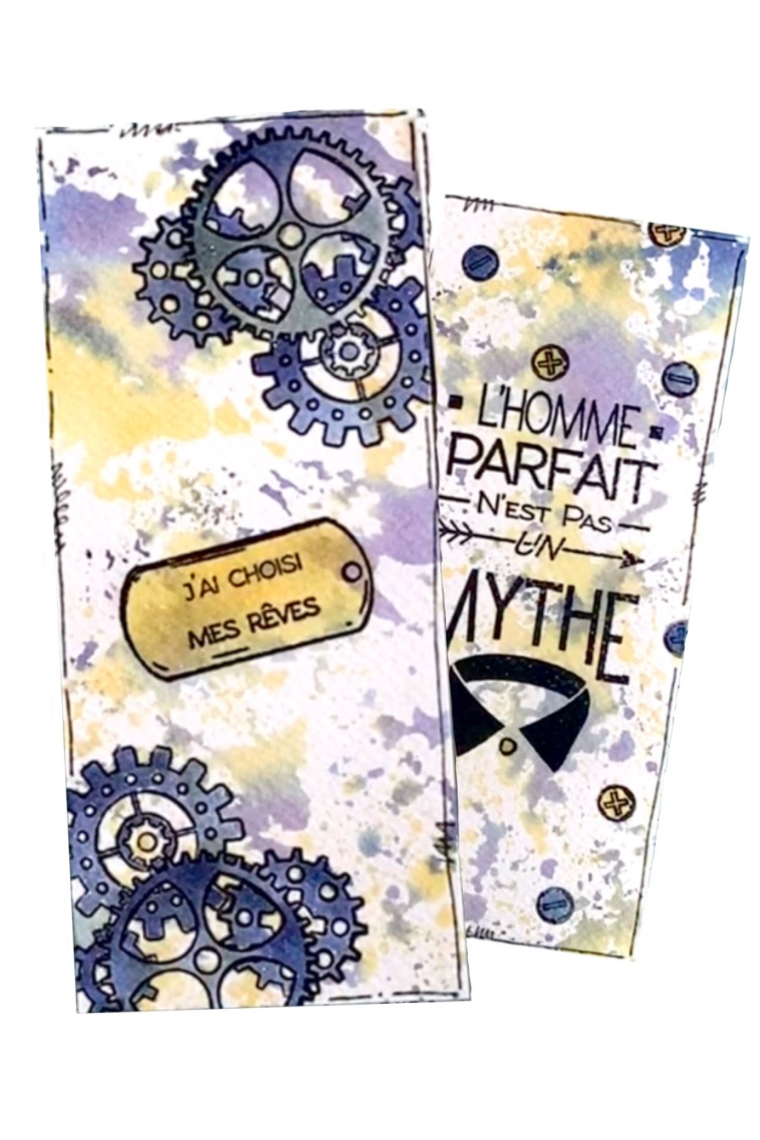 Sur du papier aquarelle nous avons déposé deux couleurs d’encres Distress à l’aide d’un sachet plastique – pour ne pas salir nos mains et pour « contrôler » les endroits où nous déposions l’encre – puis nous avons tamponé différents motifs des planches Crazy Little Craft.