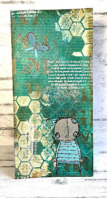 Avec le pochoir « Nid d’abeilles » et la pâte à craqueler Stampéria j’ai créé un peu de volume et j’ai couvert le blanc de la pâte avec un Distress Crayon « Vintage Photo ».